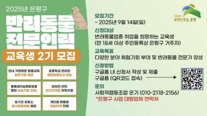[뉴스스텝] 서울 은평구는 반려동물 전문가를 양성하고 취·창업을 연계 지원하는 ‘반려동물 전문인력 양성 과정‘ 2기 교육생을 오는 9월 14일까지 모집한다고 밝혔다.