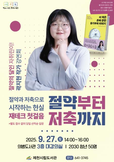 [뉴스스텝] 제천시립도서관은 오는 27일 오후 2시, 의병도서관 3층 대강의실에서 곽지현 작가 초청 강연 '절약부터 저축까지'를 개최한다.