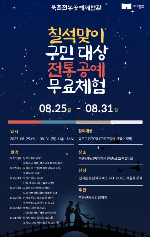 [뉴스스텝] 종로구가 2025년 음력 칠월칠석(8월 29일)을 맞아 북촌전통공예체험관(북촌로12길 24-5)에서 '칠석맞이 주민친화행사'를 개최한다.