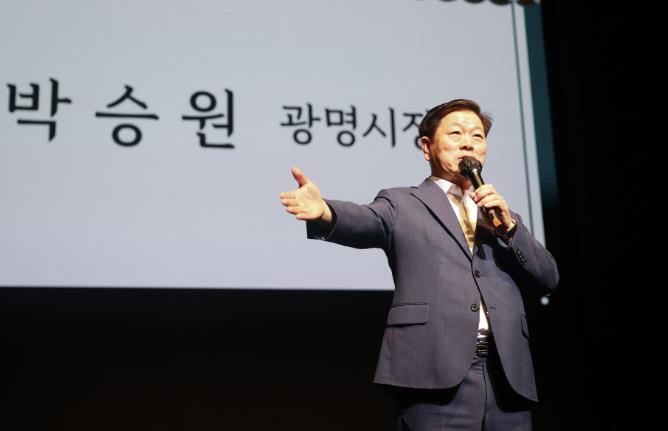 ▲ 박승원 광명시장이 지난 21일 광명극장에서 드림스타트 아동과 가족 대상 오페라 공연 시작 전 인사말을 하고 있다. |