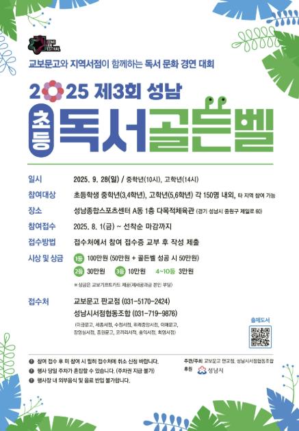 대회에 참가하려는 초등 3~6년생은 교보문고 판교점, 미금문고, 세종서점, 수정서점 등 11곳의 지역 내 서점 접수처를 방문해 선착순으로 신청하면 된다.