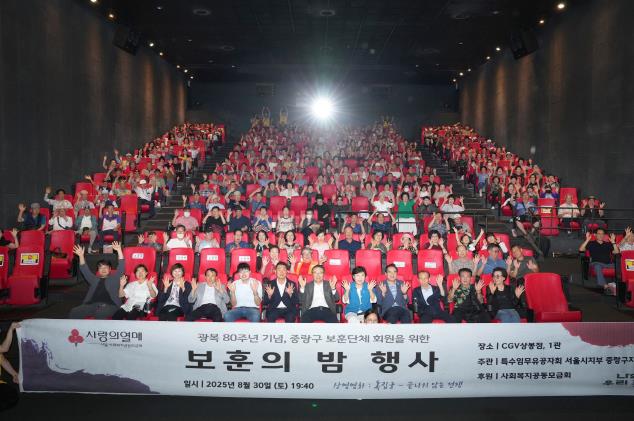[뉴스스텝] 중랑구는 광복 80주년을 기념해 지난 8월 30일 CGV 상봉점에서 보훈단체 회원 320여 명을 초청해 ‘보훈의 밤 [보훈단체 영화 관람] 행사’를 개최했다. 이번 행사는 광복의 역사적 의미를 함께 되새기고, 보훈가족에게 감사와 예우를 전하고자 마련됐다.