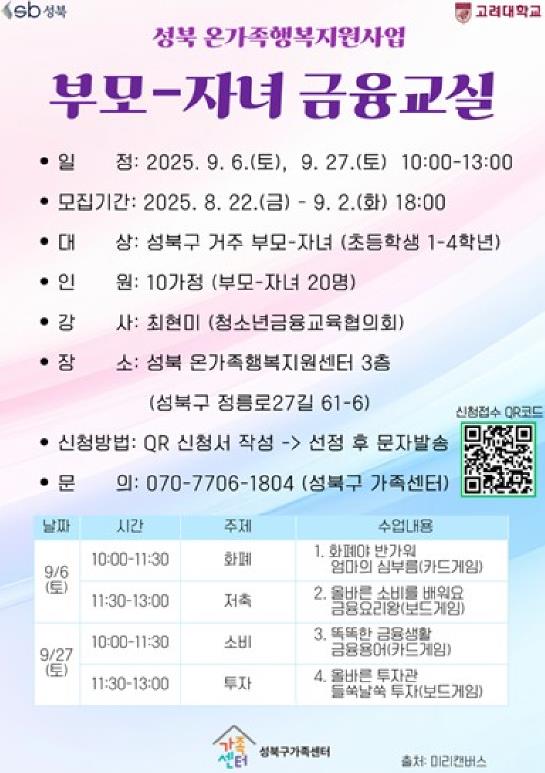 9월 부모-자녀 금융교실은 오는 9월 6일과 27일 성북구 온가족행복지원센터에서 열리며, 참가 신청은 성북구 가족센터 홈페이지를 통해 할 수 있다.
