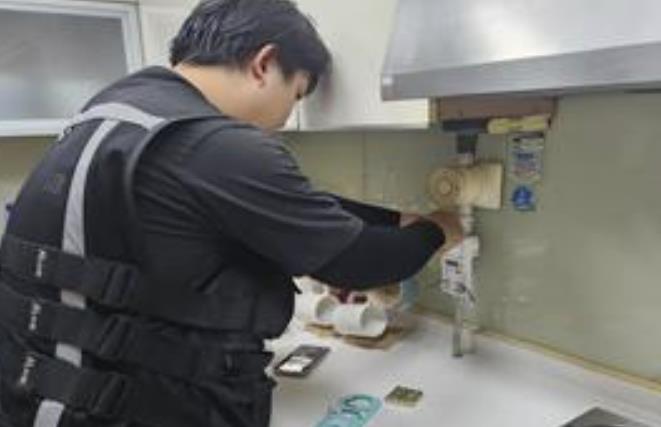 ▲ 대상자 가구에 가스밸브 자동잠금장치를 설치하고 있는 모습 |