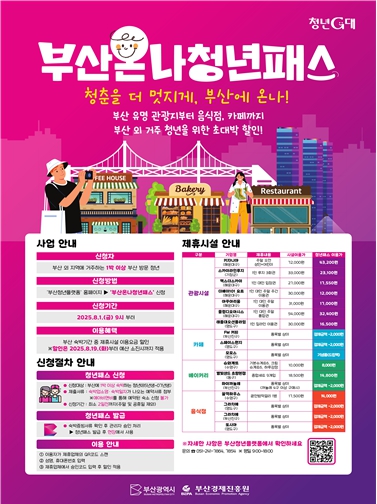 부산을 방문한 다른 지역 청년들은 '부산온나청년패스'로 부산의 대표적인 체험시설과 지역업체를 이용할 수 있으며, 패스 이용자에게는 실질적 할인 혜택이 주어진다. 할인은 8월 19일부터 예산 소진 시까지 적용된다.