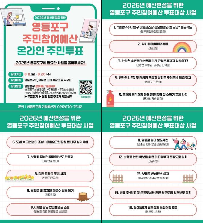 영등포구 주민 또는 관내 직장인과 학생 등 누구나 참여할 수 있으며, 영등포구 누리집(홈페이지) 주민참여예산 페이지를 통해 1인당 최대 2개 사업에 투표할 수 있다. 투표 결과는 사업 우선순위 결정에 활용되며, 최종 선정된 사업은 2026년도 예산에 반영하여 추진될 예정이다.