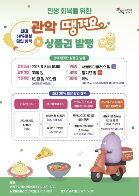 박준희 구청장은 “땡겨요 상품권 추가 발행이 소상공인의 숨통을 틔우고, 소비자에게는 높은 할인 혜택을 제공해 골목상권을 비롯한 관악구 지역경제에 활력을 불어넣어줄 마중물이 되기를 기대한다”라며 “매번 조기 완판으로 상품권 구매가 어려웠던 주민들께서는 30억 규모로 상품권이 발행되는 만큼 이번 기회를 꼭 잡으시기를 바란다”라고 말했다.