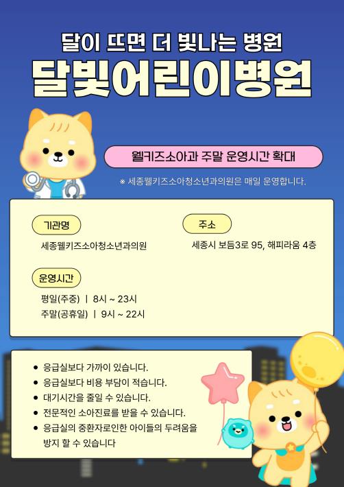 [뉴스스텝] 세종특별자시치가 시민들의 야간·주말 소아진료 불편을 해소하기 위해 ‘달빛어린이병원’웰키즈소아청소년과의원의 주말 야간 진료시간을 1시간 연장 운영한다고 25일 밝혔다.