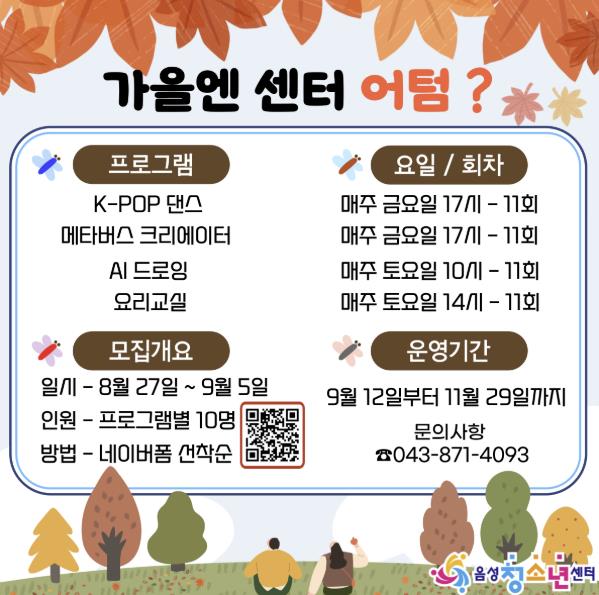 [뉴스스텝] 음성청소년센터는 신학기를 맞이해 청소년들을 위한 문화프로그램 ‘가을엔 센터 어텀?’을 운영한다고 밝혔다.