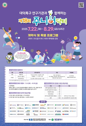 대전시가 주최하고 한국기초과학지원연구원이 주관하는 ‘주니어닥터 프로그램’은 청소년들이 대덕연구개발특구 내 출연연, 대학, 공공기관, 민간기관 등 총 35개 참여기관에서 과학기술 인프라를 체험하며 과학자의 꿈을 키울 수 있도록 지원하는 여름방학 과학 체험 프로그램이다.