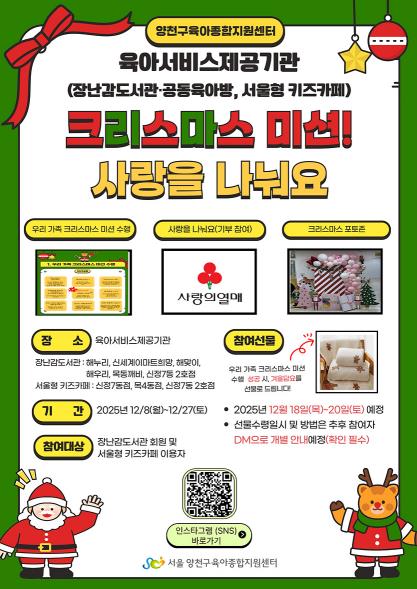 [뉴스스텝] 양천구는 크리스마스를 맞아 관내 장난감도서관 및 서울형 키즈카페 이용 가족을 대상으로 ‘2025 크리스마스 미션! 사랑을 나눠요’ 이벤트를 12월 8일부터 27일까지 운영한다고 밝혔다.