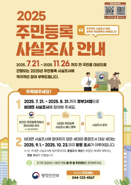 이번 조사는 7월 21일부터 다음 달 31일까지 정부24 앱을 통해 비대면 조사를 하고, 9월 1일부터 10월 23일까지 비대면 조사에 참여하지 않은 세대와 중점 조사 대상 세대를 대상으로 이·통장과 공무원이 직접 방문해 실거주 여부를 확인하는 현장 방문 조사를 진행한다.
