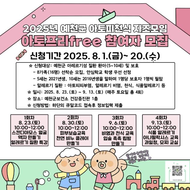 [뉴스스텝] 예천군은 8월 23일부터 9월 13일까지 알레르기 질환을 앓고 있는 아동과 보호자를 위한 아토피‧천식 자조모임 ‘아토프리free’ 프로그램을 매주 토요일, 총 4회에 걸쳐 운영한다.