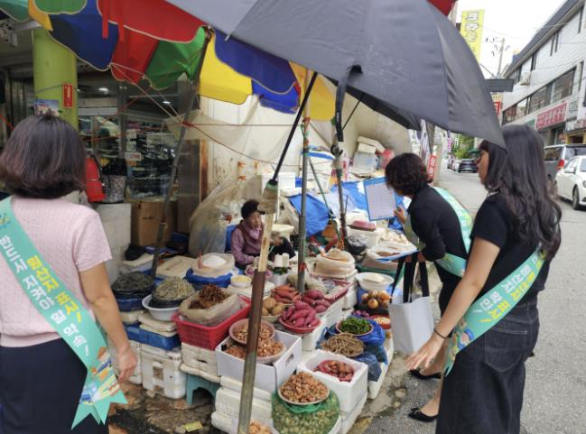 ▲ 온양온천 전통시장에서 상인에게 농산물 원산지 표시제를 홍보하고 있다. |