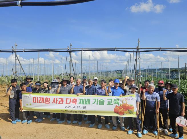 [뉴스스텝] 당진시농업기술센터는 지난 25일 관내 사과 농가 및 희망자를 대상으로 미래형 사과 다축 재배 기술 이론 및 현장 교육을 추진했다고 26일 밝혔다.