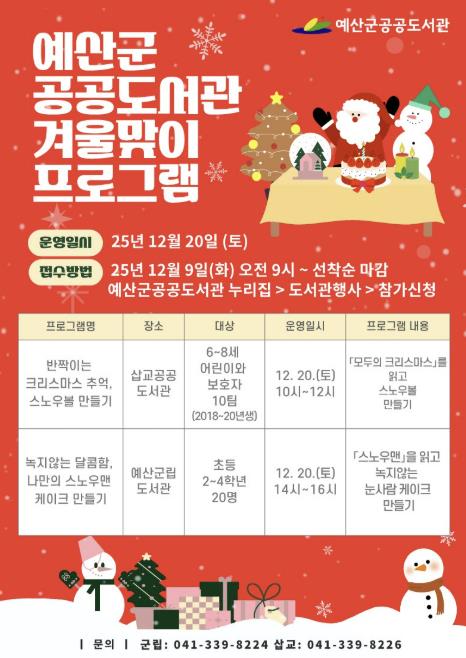 [뉴스스텝] 예산군 공공도서관은 겨울철을 맞아 오는 12월 20일 어린이와 가족이 함께 참여할 수 있는 ‘겨울맞이 크리스마스 체험 프로그램’을 운영한다.