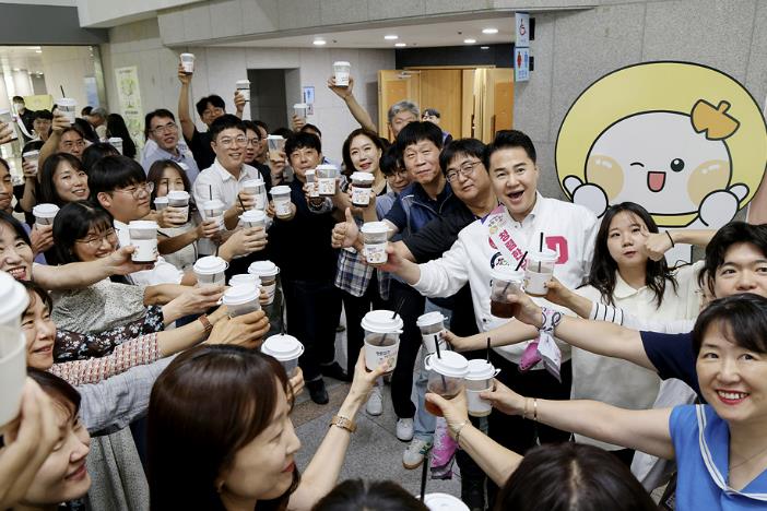 ▲ 오언석 도봉구청장과 직원들이 청렴 문구가 적힌 음료 잔을 들고 사진을 찍고 있다
