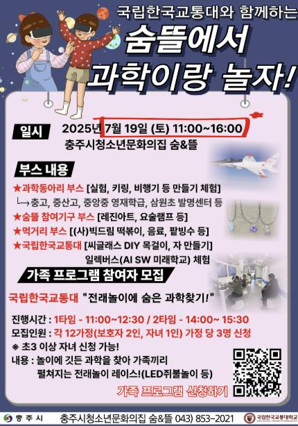 [뉴스스텝] 충주시 청소년문화의집 숨·뜰(관장 고미숙)은 오는 19일 오전 11시 ‘2025 국립한국교통대학교와 함께하는 숨뜰에서 과학이랑 놀자’를 진행한다.