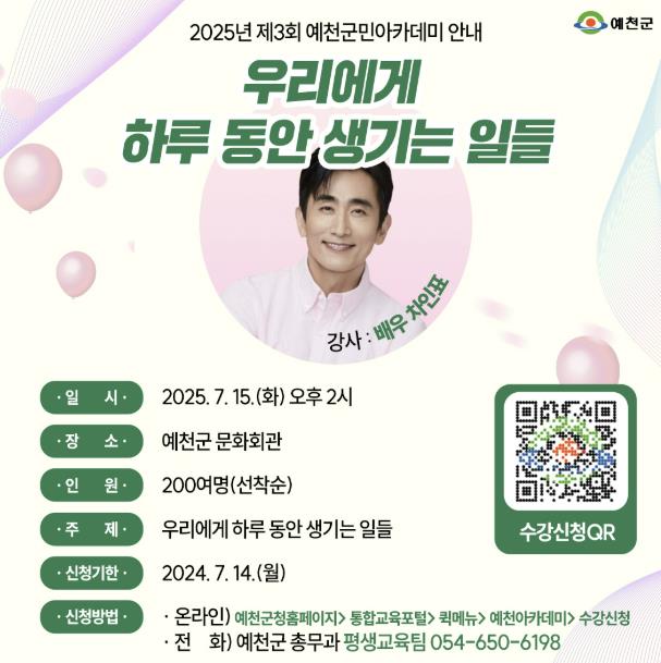 [뉴스스텝] 예천군은 이달 15일 오후2시, 예천군문화회관에서 ‘2025년 제3회 예천군민아카데미’를 개최한다.