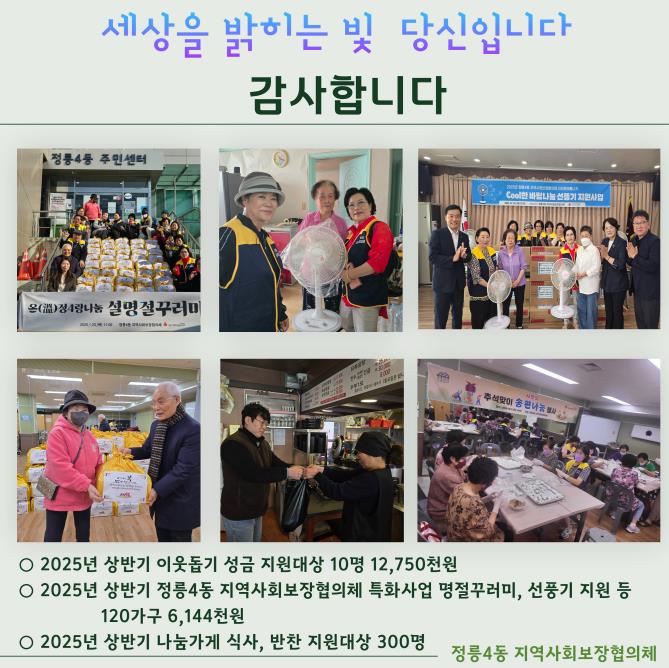 정릉4동 지역사회보장협의체는 이번 행사를 시작으로 오는 12월까지 ‘세상을 밝히는 빛 감사데이’를 이어갈 예정이다. 후원 단체와 나눔 가게를 직접 찾아 감사 인사를 전하고, 성과를 공유함으로써 지속 가능한 나눔 분위기 확산과 건강한 마을 공동체 조성에 박차를 가한다는 계획이다.