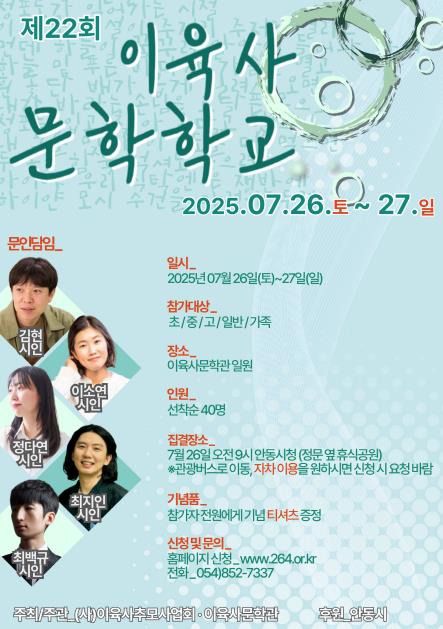 올해로 22번째를 맞는 이육사문학학교는 문학을 사랑하는 이들에게 창작의 기쁨과 감동을 선사하는 자리로, 김현 시인, 이소연 시인, 정다연 시인, 최지인 시인, 최백규 시인이 문인담임으로 참여해 참가자들과 깊이 있는 교감을 나눌 예정이다.