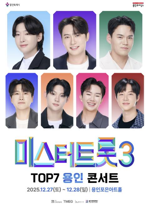 이번 공연은 지난 3월 종영한 TV조선 ‘미스터트롯3’를 통해 전국적인 사랑을 받은 TOP7 김용빈, 손빈아, 천록담, 춘길, 최재명, 남승민, 추혁진이 출연한다. 화려한 무대 연출과 다채로운 구성으로 용인시민에게 수준 높은 공연을 선사할 예정이다.
