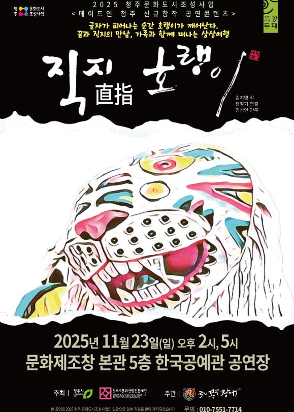 변광섭 청주문화재단 대표는 “지난 12일 무대에 오른 ‘육거리 시장의 기적 : 수호신들의 귀환’에 이어 이번 ‘직지호랭이’까지, 문화도시 청주는 청주만의 이야기를 공연콘텐츠화하는 의미 있는 시도를 이어왔다”며 “지역 예술단체들을 통해 창작된 청주 기록문화의 가치가 더 많은 무대로 확산되도록 응원을 보내주시길 바란다”고 초대의 말을 전했다.