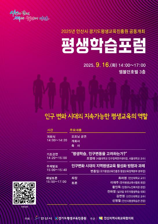 [뉴스스텝] 경기도평생교육진흥원은 16일 안산 엠블던호텔에서 안산시와 공동으로 ‘인구 변화 시대의 지속가능한 평생교육의 역할’을 주제로 평생학습포럼을 열었다.