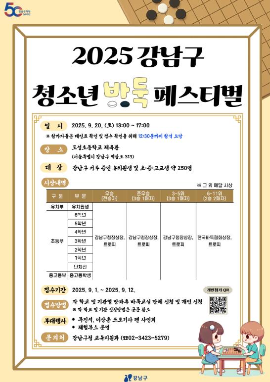 [뉴스스텝] 꿈이 모이는 도시, 미래를 그리는 강남구가 오는 9월 20일 오후 1시부터 5시까지 서울도성초등학교 체육관(역삼로 313)에서 ‘2025 청소년 바둑 페스티벌’을 개최한다.