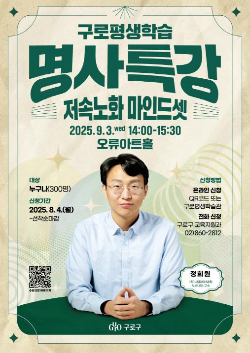 명사특강은 8월 4일부터 구로구민을 포함한 누구나 구로평생학습관 누리집이나 포스터의 큐알(QR)코드를 통한 온라인 신청 또는 구청 교육지원과로 전화해서 신청하면 된다.