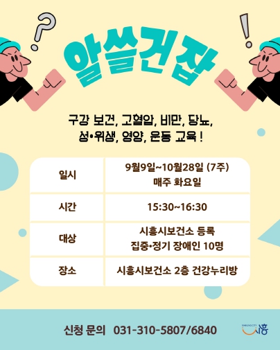 이형정 시흥시보건소장은 “이번 알쓸건잡 프로그램이 장애인들의 건강관리와 삶의 질 향상에 실질적인 도움이 되길 바란다”라며 “앞으로도 지역 장애인을 위한 보건·재활 서비스를 적극적으로 확대해 나가겠다”라고 말했다.