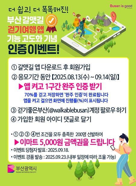 ‘갈맷길 걷기 인증 이벤트’는 앱을 이용하여 갈맷길 1개 구간을 완보하면 모바일 쿠폰(200명 추첨)을 제공하는 행사로, 이벤트 참여 기간은 9월 14일까지이며, 당첨자는 9월 18일에 발표할 예정이다.