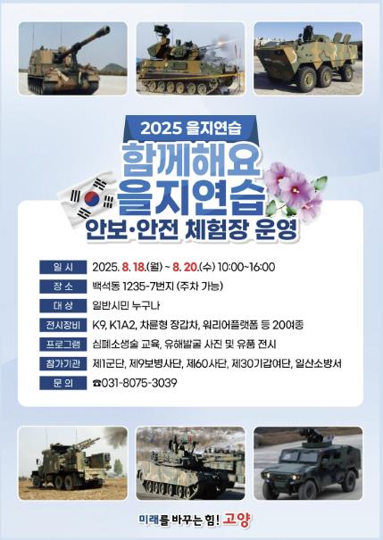 을지연습 안보·안전체험장은 매일 오전 10시부터 오후 4시까지 일산동구 백석동 1237-5번지에서 운영되며 고양시민 누구나 참여가 가능하다.