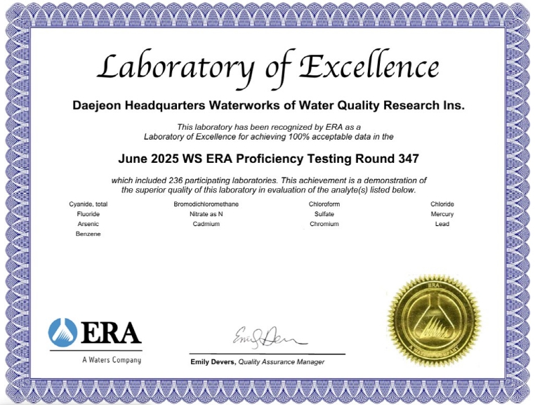 6월 9일부터 7월 24일까지 2025년 국제숙련도평가 프로그램에 참여하여, 중금속, 휘발성 유기화합물(VOCs), 음이온 성분 등 먹는 물 분야 13개 항목에서 모두‘적합’ 판정을 받았다.