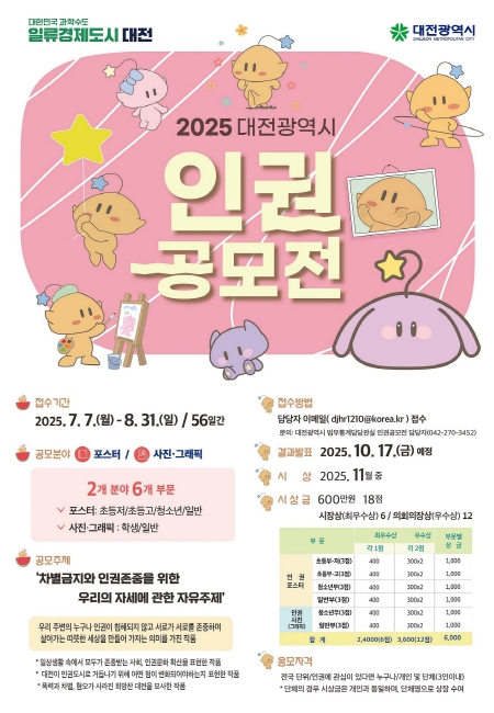 [뉴스스텝] 대전시는 시민들의 인권 감수성을 높이고 인권문화를 확산시키기 위해 ‘2025 대전광역시 인권공모전’을 개최한다.