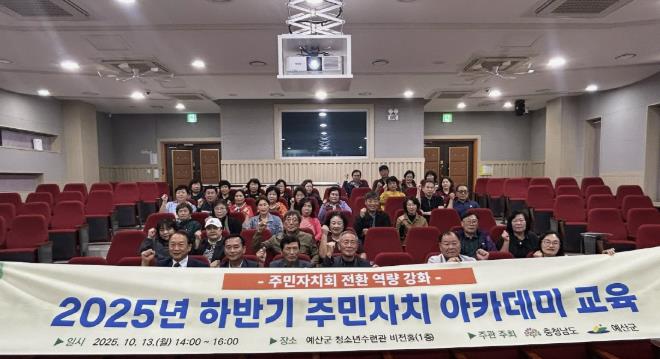 [뉴스스텝] 예산군은 예산군청소년수련관 비전홀에서 주민자치회 미전환 읍면 주민자치위원 50여명을 대상으로 ‘2025년 하반기 주민자치 아카데미 집합교육’을 진행했다고 17일 밝혔다.