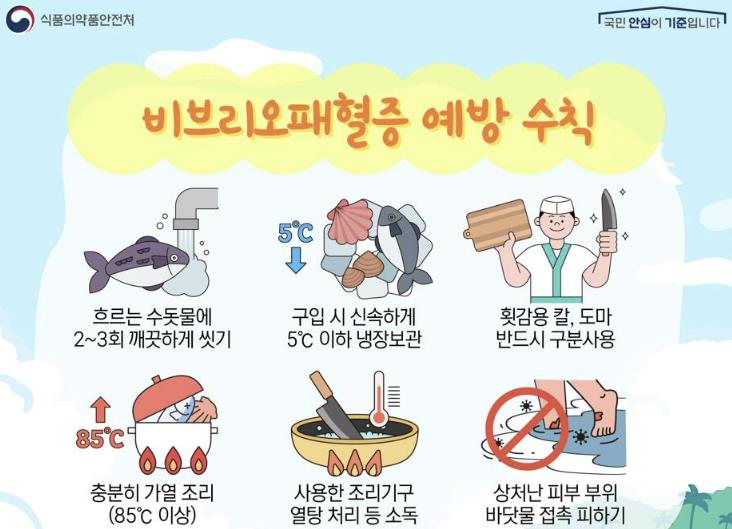 비브리오균에 감염될 경우 발열, 오한, 설사, 복통 등 장염 증상이 나타날 수 있으며, 상처 감염 시 부종, 수포 등이 나타난다. 이를 예방하기 위해서는 어패류를 충분히 익혀서 섭취하고 상처가 난 피부 부위는 바닷물 접촉을 조심해야 한다.