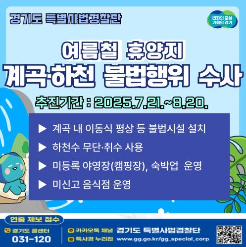 [뉴스스텝] 여름 휴가철을 맞아 경기도가 7월 21일부터 8월 20일까지 도내 주요 계곡과 하천 등 휴양지에서 발생하는 불법행위를 집중 단속한다.