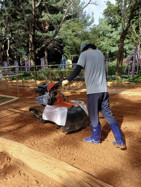 ▲ 성남시 황송공원 내 황톳길에서 로터리 작업(흙 뒤집기)을 진행하고 있다