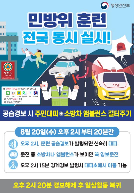 이날 훈련에서는 ▲공습 대비 주민대피훈련 ▲긴급차량 길터주기 훈련 ▲다중이용시설 시범훈련이 진행될 예정이다.