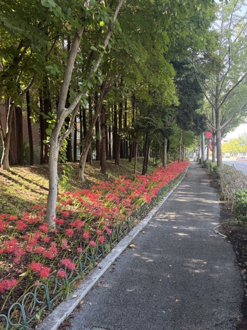 상록수 숲길과 어우러진 꽃무릇이 산책길을 물들이며, 정자와 쉼터, 야간 조명도 설치돼 있어 낮과 밤 모두 즐기기 좋은 산책 코스다.