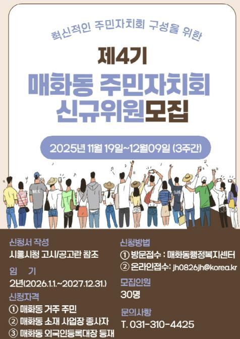 [뉴스스텝] 시흥시 매화동 행정복지센터는 12월 9일까지 ‘제4기 매화동 주민자치회’ 신규위원 30명을 공개 모집한다. 신청은 매화동 행정복지센터 방문 또는 전자우편을 통해 가능하다.