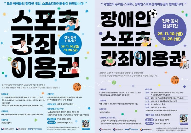 신청 대상은 5세부터 18세까지(2008~2021년 출생)의 저소득층으로, 월 최대 10만 5천 원까지 지원받을 수 있다. ‘장애인스포츠강좌이용권’은 5세부터 69세까지(1957~2021년 출생)의 장애인이 신청할 수 있으며, 월 최대 11만 원까지 지원받는다.