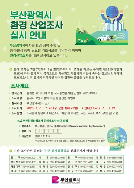 정나영 시 미래기술전략국장은 “환경산업조사는 환경산업의 구조와 경영실태 등을 파악해 부산의 환경산업·기술 정책 수립 및 평가에 활용되는 중요한 통계”라며, “정확한 통계 작성을 위해 조사 대상 업체들의 적극적인 참여와 응답을 부탁드린다”라며 조사 협조를 당부했다.