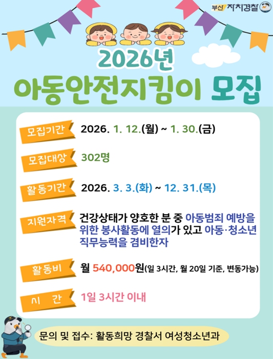 [뉴스스텝] 부산시 자치경찰위원회는 부산경찰청과 함께 오는 1월 12일부터 1월 30일까지 '2026년 아동안전지킴이'를 모집한다고 밝혔다.