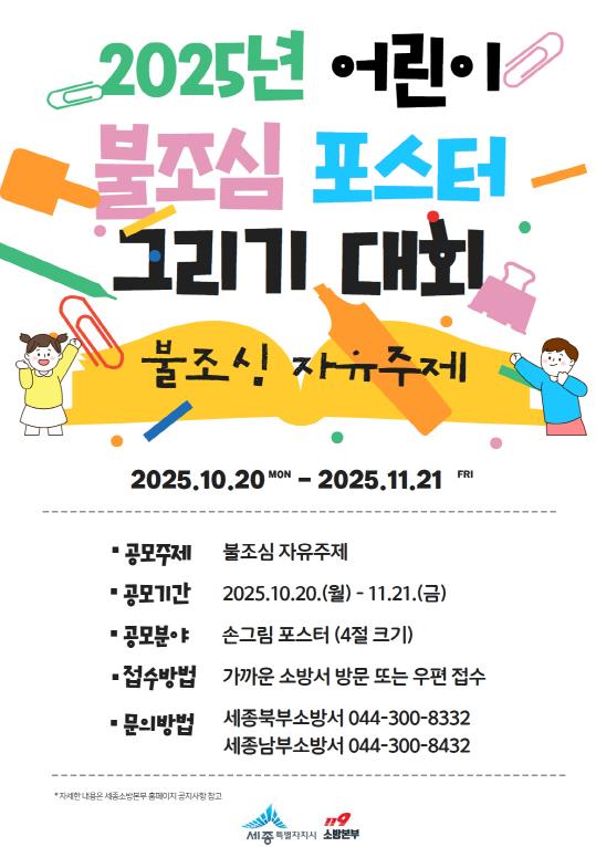 [뉴스스텝] 세종소방본부가 20일부터 내달 21일까지 ‘2025년 어린이 불조심 포스터 그리기 공모전’을 개최한다.