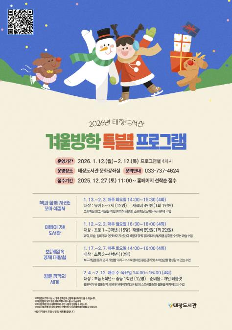 [뉴스스텝] 원주시 태장도서관은 겨울방학을 맞아 1월 12일부터 2월 12일까지 겨울방학 특별 프로그램을 운영한다.