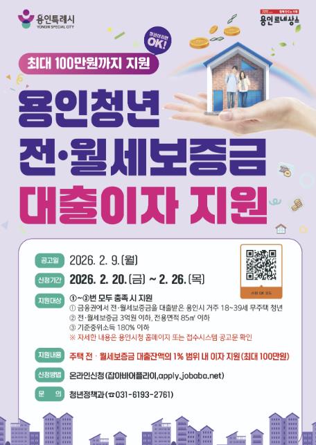 이 사업은 전월세 보증금 대출을 이용 중인 용인에 주민등록을 둔 무주택 18~39세 청년을 대상으로, 대출잔액의 1% 내에서 최대 100만 원까지 이자를 지원하는 제도다.