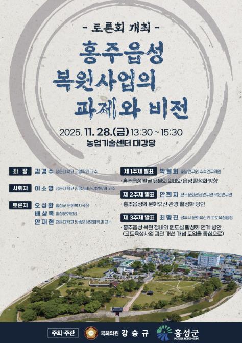 주제발표에는 홍주읍성 발굴 유물의 의미와 활용 활성화 방향, 홍주읍성 문화유산 관광 활성화 방안, 홍주읍성 복원정비와 연계한 원도심 활성화 방안으로 구성되며, 홍주읍성의 역사성 회복과 관광 자원화에 초점이 맞추어질 전망이다.