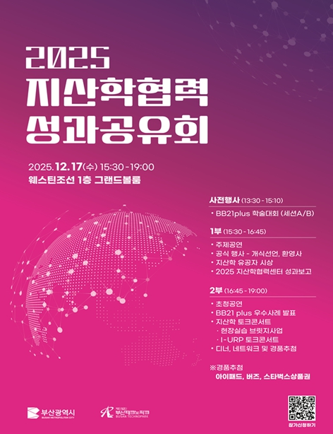 김귀옥 시 청년산학국장은 “한 해 동안 지산학협력을 통한 지역 발전에 애써 주신 대학과 기업, 그리고 관계자분들께 감사드린다”라며, “이번 성과공유회를 통해 부산이 더욱 도약하기를 바란다. 대학, 기업, 연구기관, 시가 함께 지역 산업을 키우고, 젊은 인재들이 부산에 머무르며 성장할 수 있는 생태계를 만들어가자”라고 전할 예정이다.
